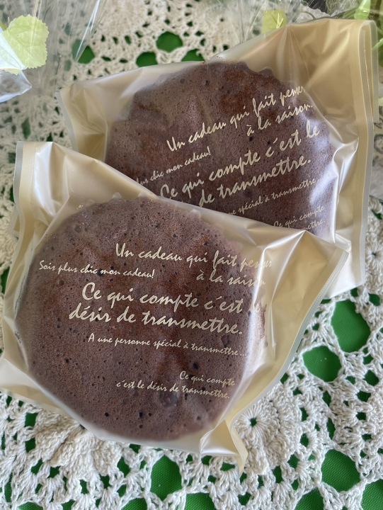 卵を使用せず生地にココアを練りこみ焼きあげ粉糖をまぶし、