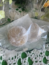 卵を使用せず生地に抹茶を練りこみ焼きあげ粉糖をまぶし、